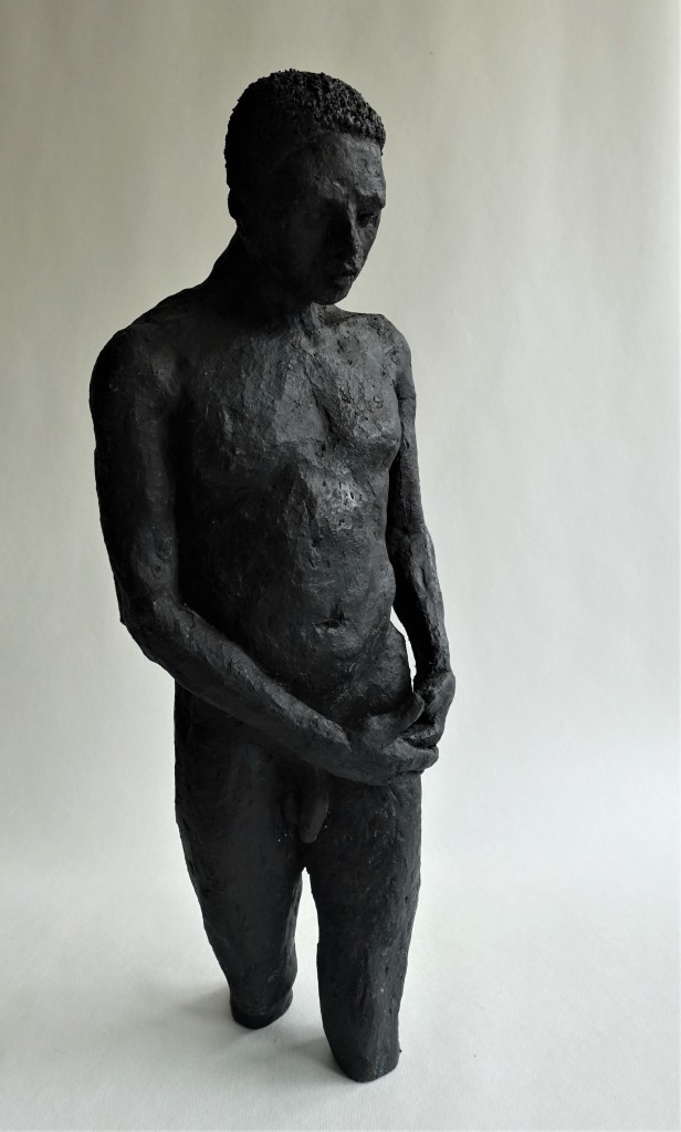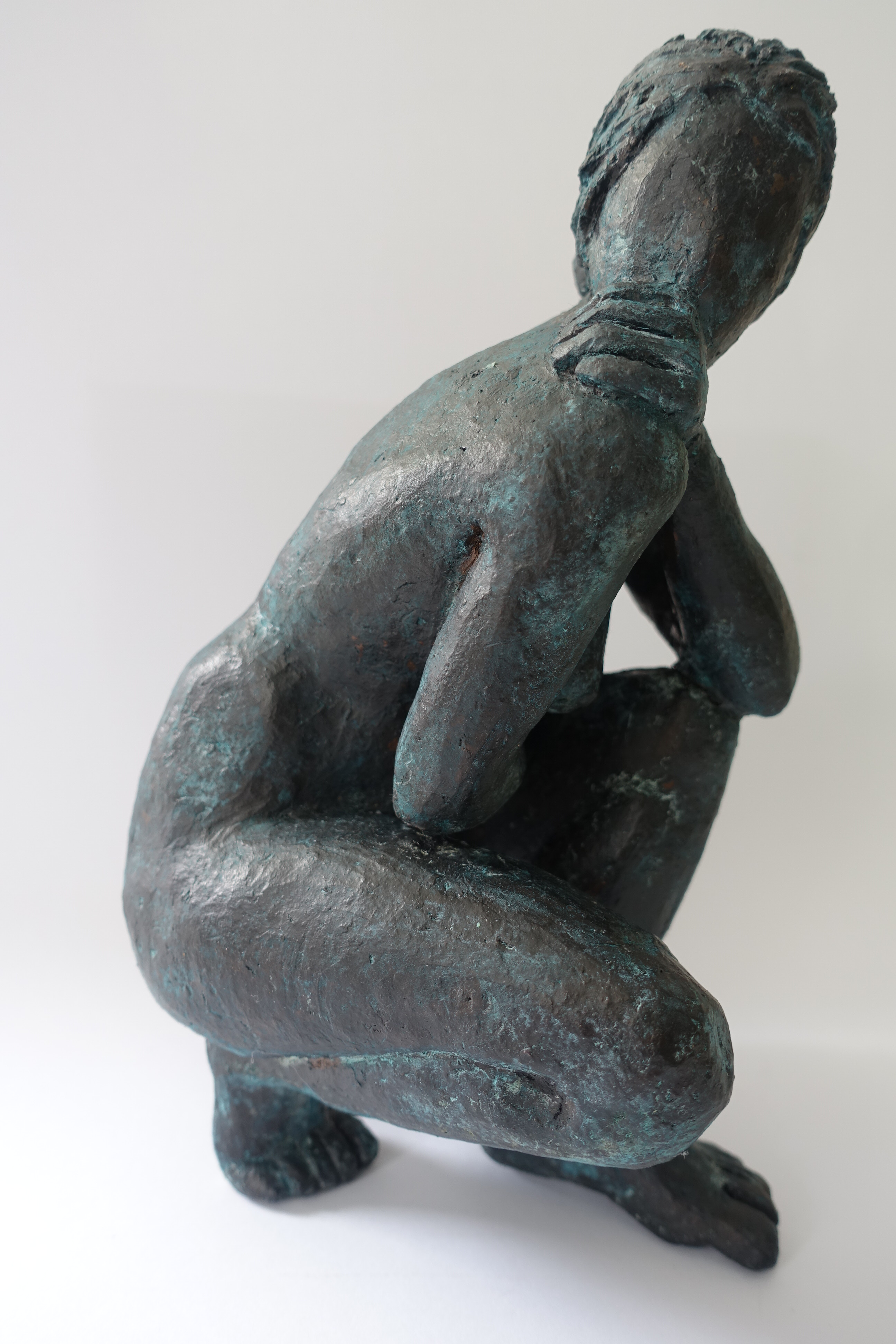 Hoogte 55 cm op sokkel 17 x 12 cm. keramiek gepatineerd.